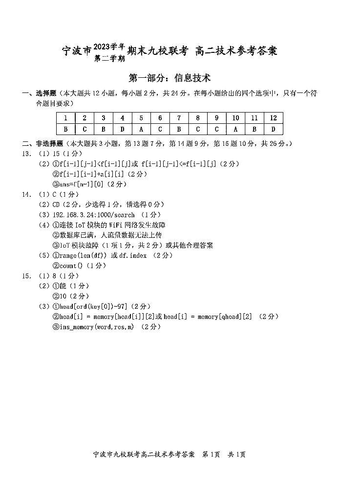 浙江省宁波市九校2023-2024学年高二下学期6月期末考试技术答案