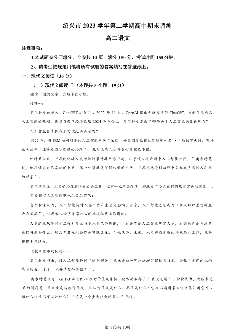 浙江省绍兴市2023-2024学年高二下学期6月期末考试语文(原卷版)