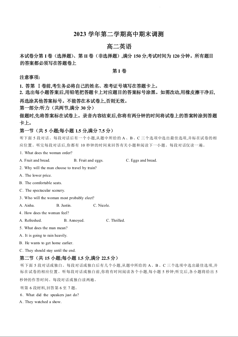 浙江省绍兴市2023-2024学年高二下学期6月期末考试英语