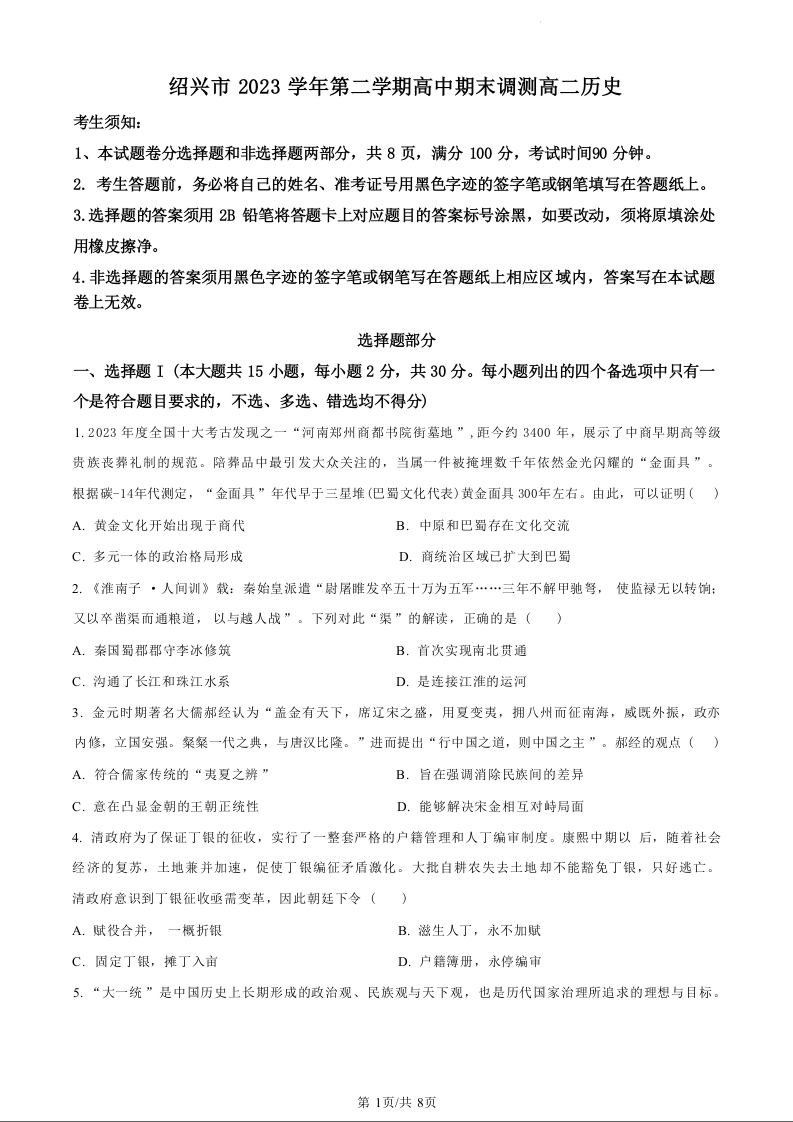 浙江省绍兴市2023-2024学年高二下学期6月期末考试历史(原卷版)