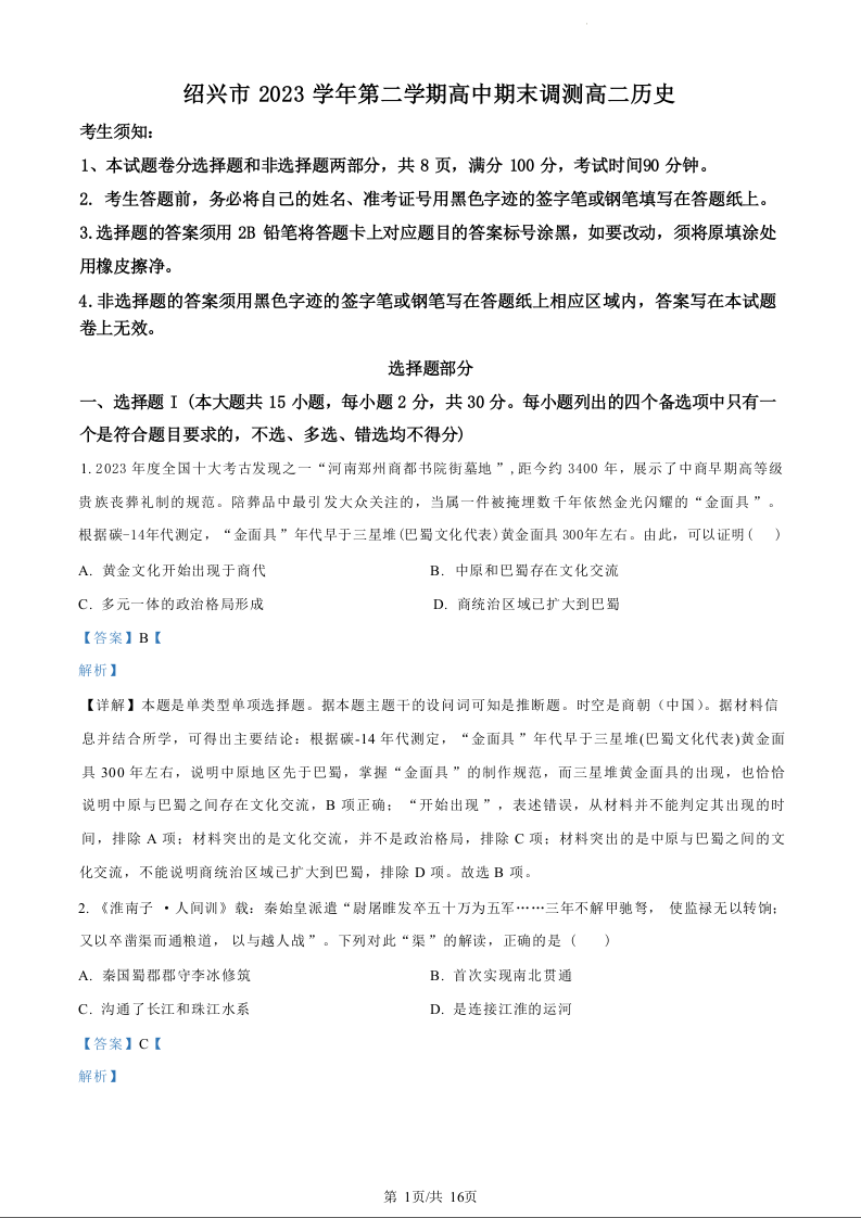 浙江省绍兴市2023-2024学年高二下学期6月期末考试历史(解析版)