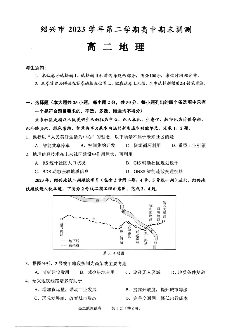 浙江省绍兴市2023-2024学年高二下学期6月期末考试地理