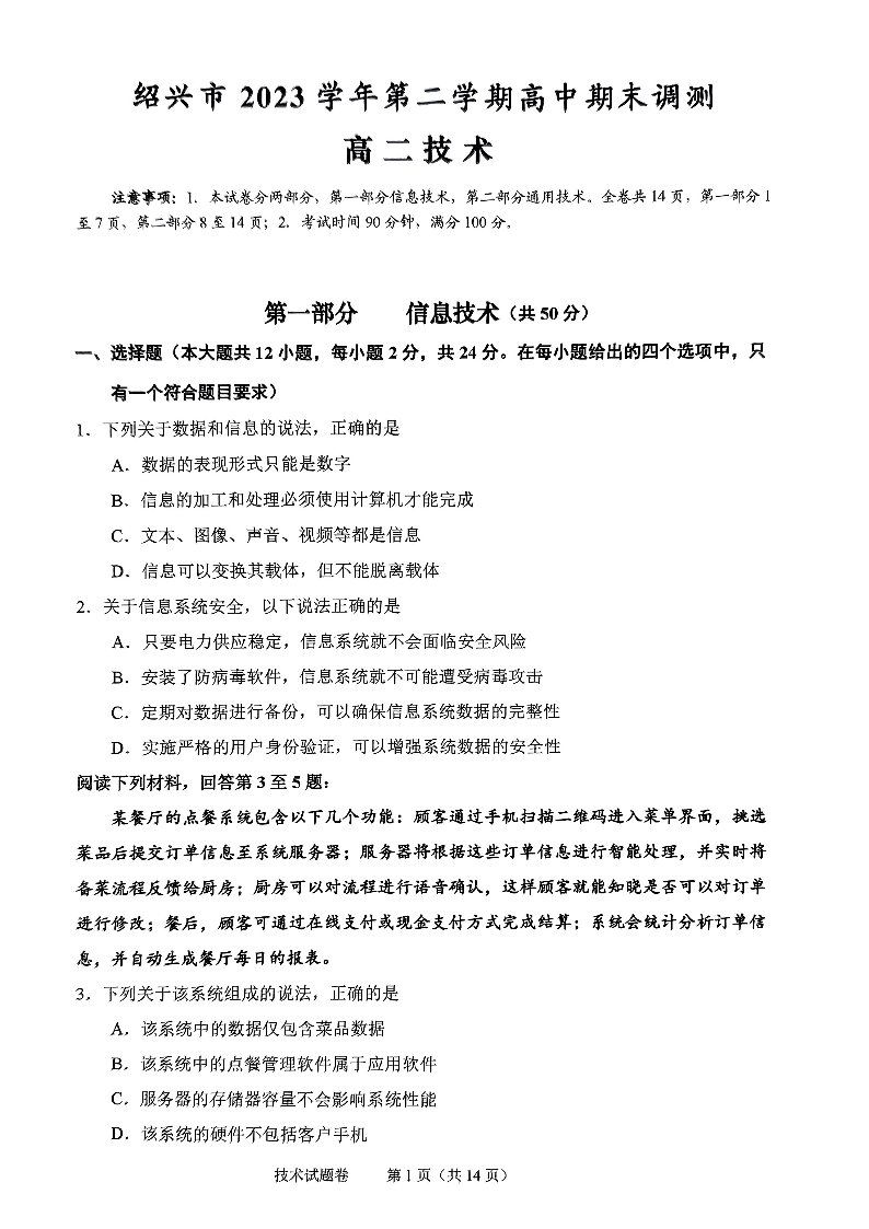 浙江省绍兴市2023-2024学年高二下学期6月期末考试技术