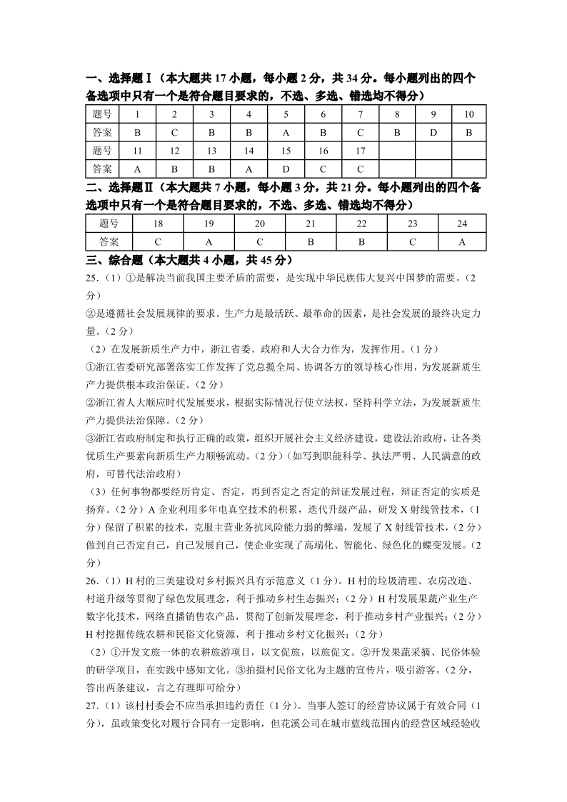浙江省台州市2023-2024学年高二下学期6月期末考试政治答案
