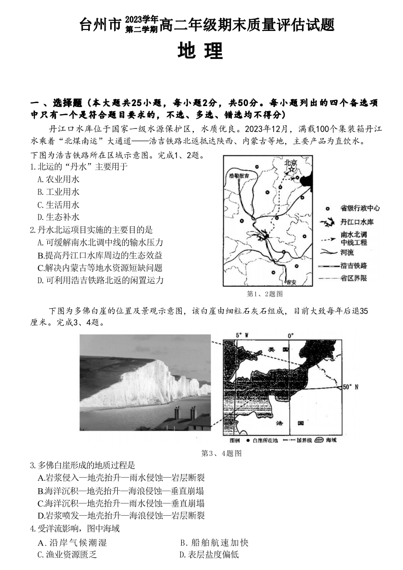 浙江省台州市2023-2024学年高二下学期6月期末考试地理