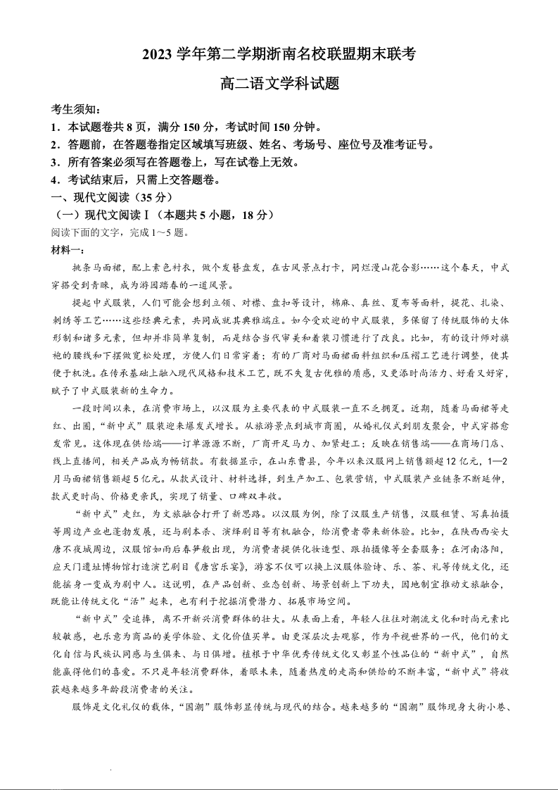 浙江省浙南名校2023-2024学年高二下学期6月期末考试语文+答案