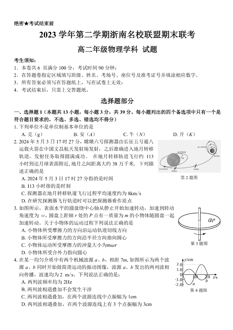 浙江省浙南名校2023-2024学年高二下学期6月期末考试物理+答案