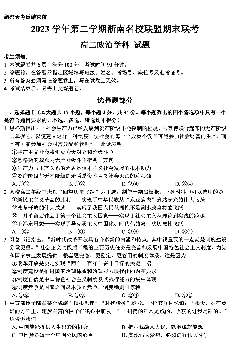 浙江省浙南名校2023-2024学年高二下学期6月期末考试政治+答案