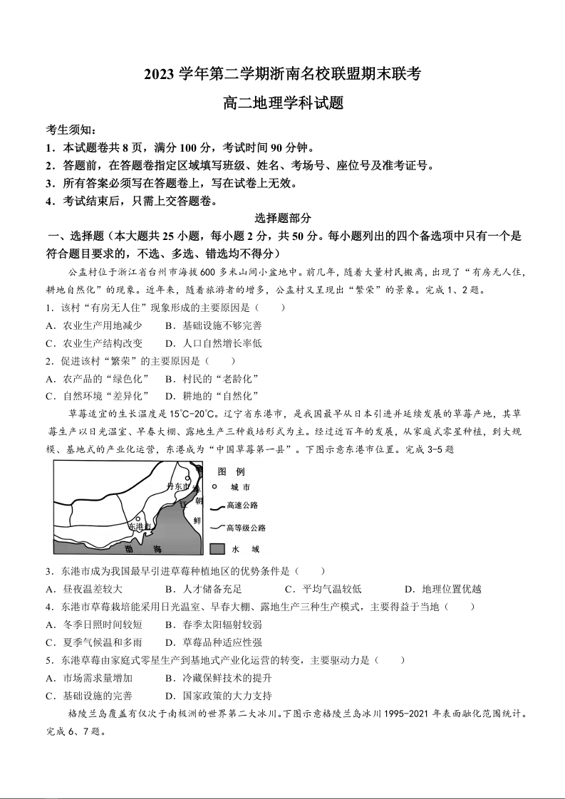 浙江省浙南名校2023-2024学年高二下学期6月期末考试地理+答案
