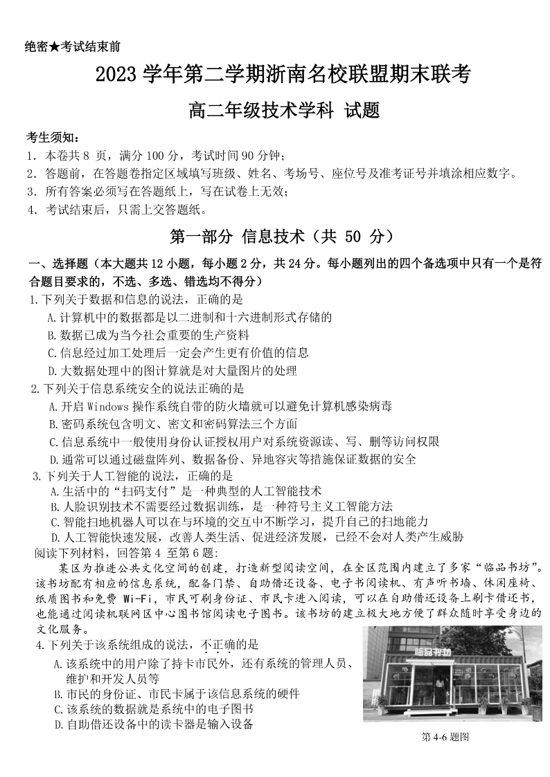 浙江省浙南名校2023-2024学年高二下学期6月期末考试技术+答案