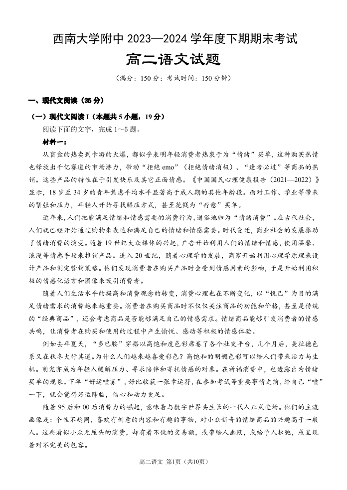 重庆市(西南大学附属中学校&重庆八中)高2025届下学期期末考试语文