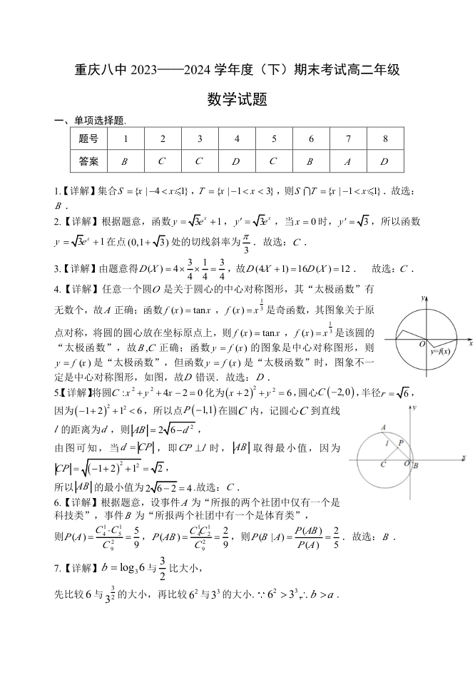 重庆市(西南大学附属中学校&重庆八中)高2025届下学期期末考试数学答案