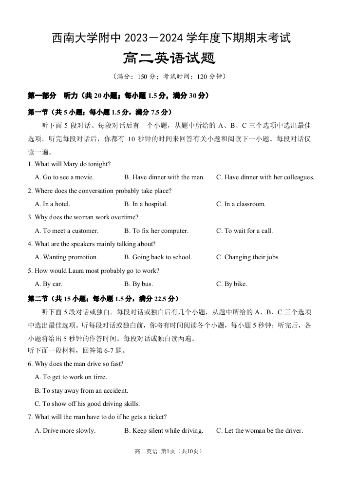 重庆市(西南大学附属中学校&重庆八中)高2025届下学期期末考试英语