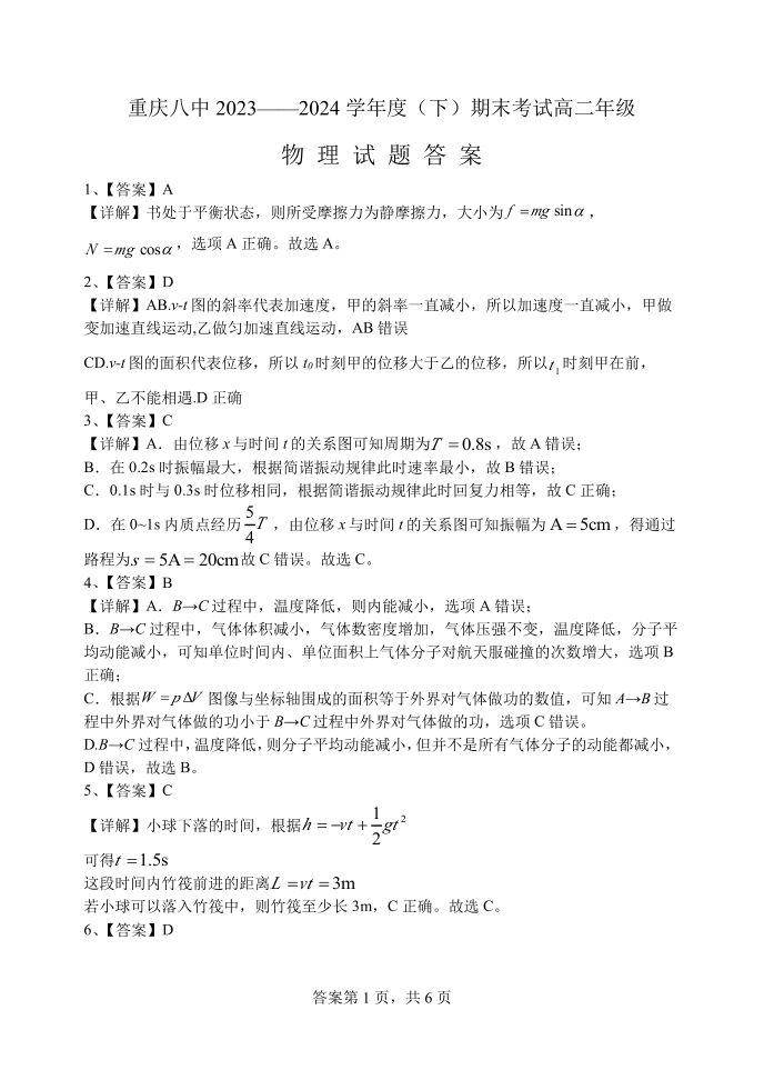 重庆市(西南大学附属中学校&重庆八中)高2025届下学期期末考试物理答案