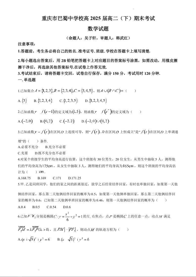 重庆市巴蜀中学高2025届下学期7月期末考试数学