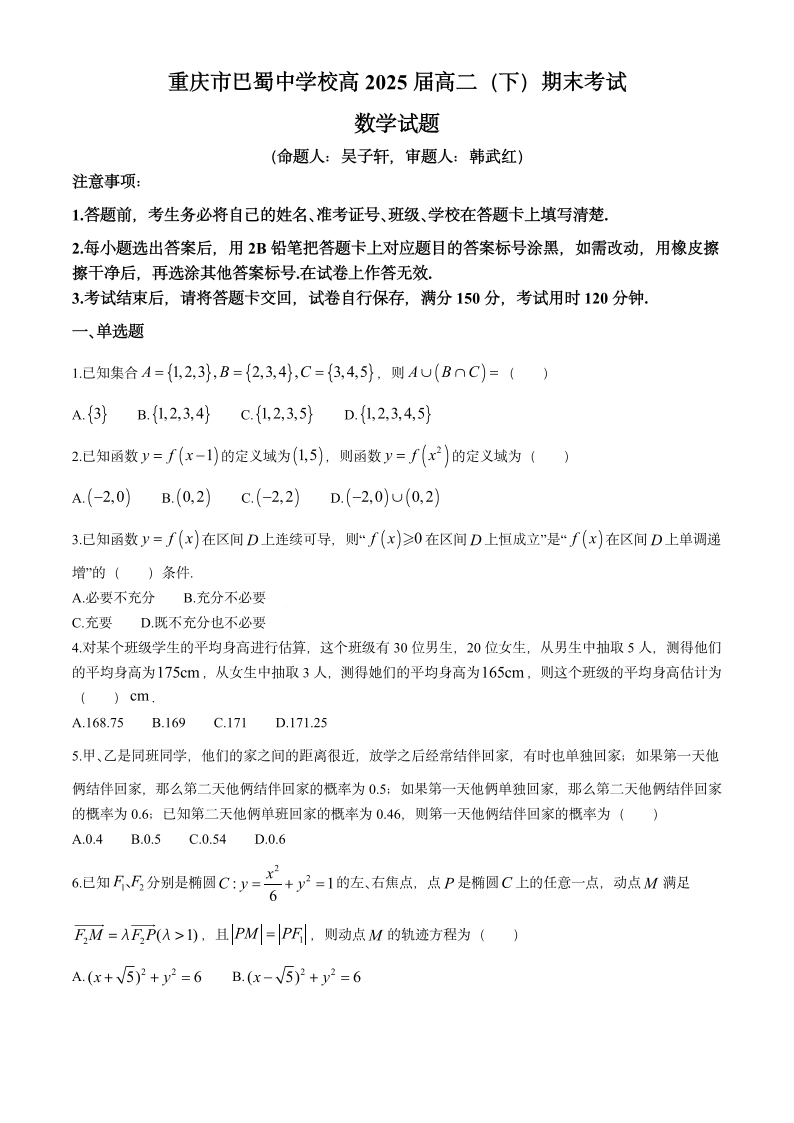 重庆市巴蜀中学高2025届下学期7月期末考试数学+答案