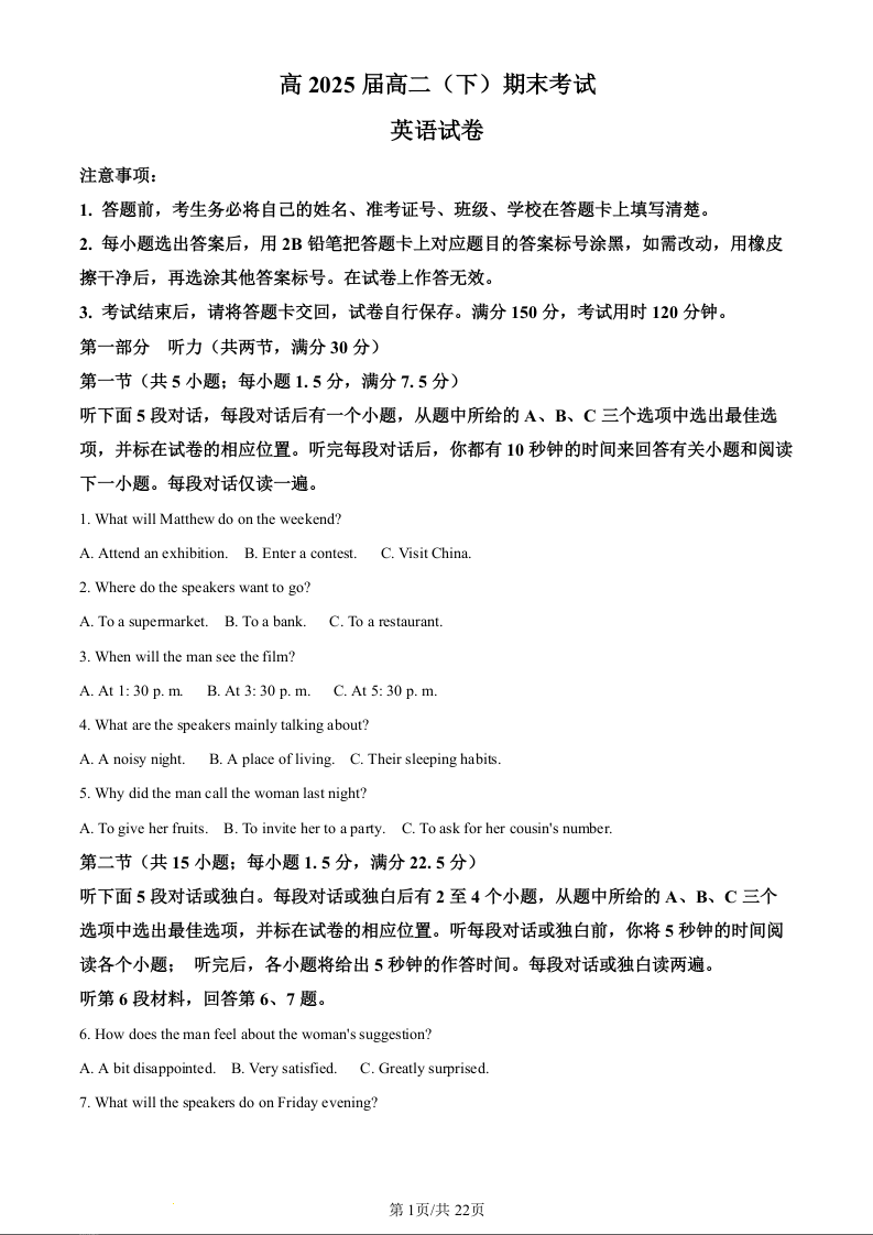 重庆市巴蜀中学高2025届下学期7月期末考试英语(精品解析版)