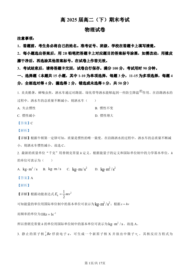 重庆市巴蜀中学高2025届下学期7月期末考试物理(精品解析版)
