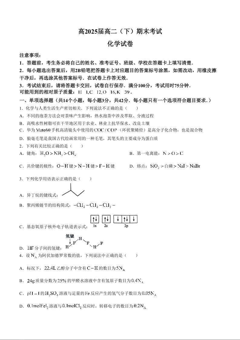 重庆市巴蜀中学高2025届下学期7月期末考试化学