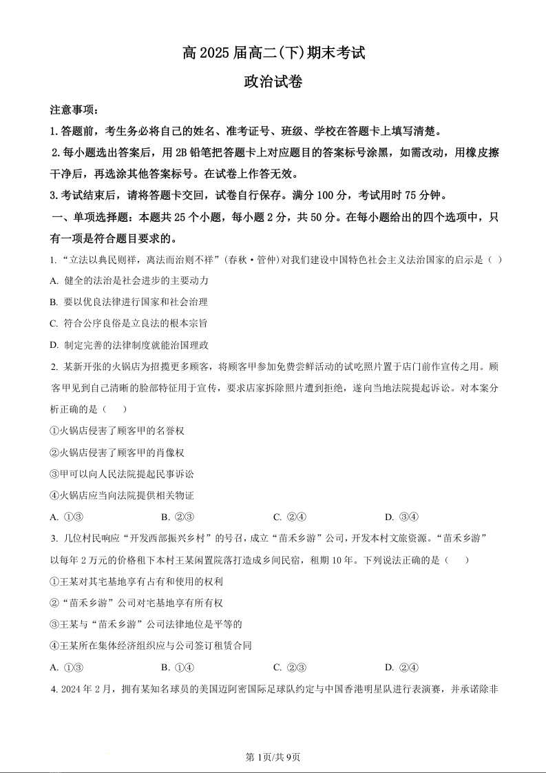 重庆市巴蜀中学高2025届下学期7月期末考试政治(原卷版)