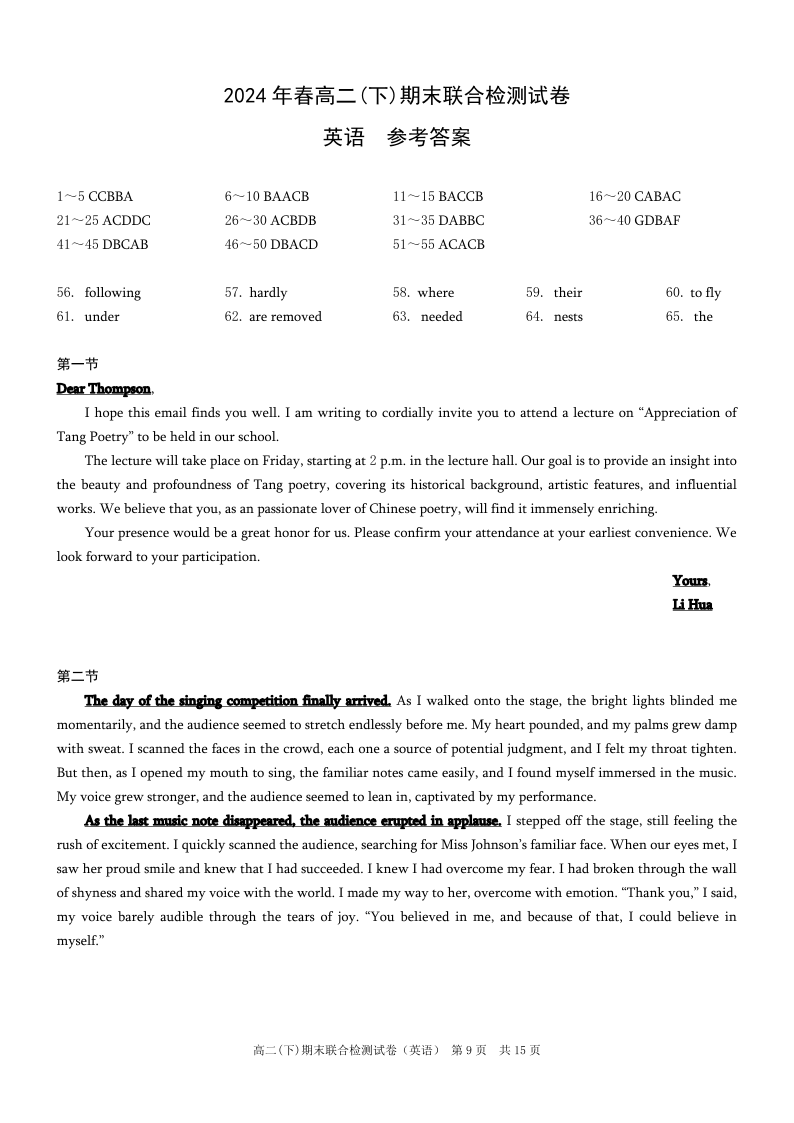 重庆康德卷高2025届(下)期末联合检测英语答案