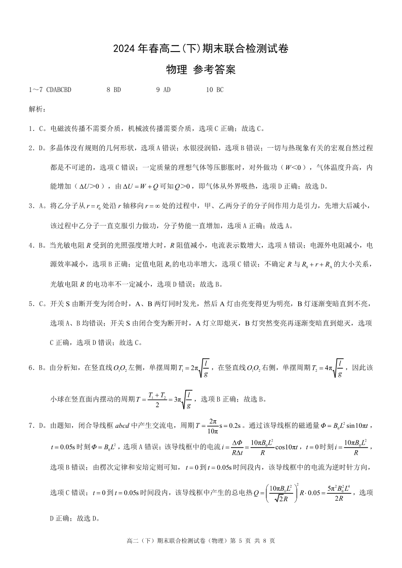 重庆康德卷高2025届(下)期末联合检测物理答案