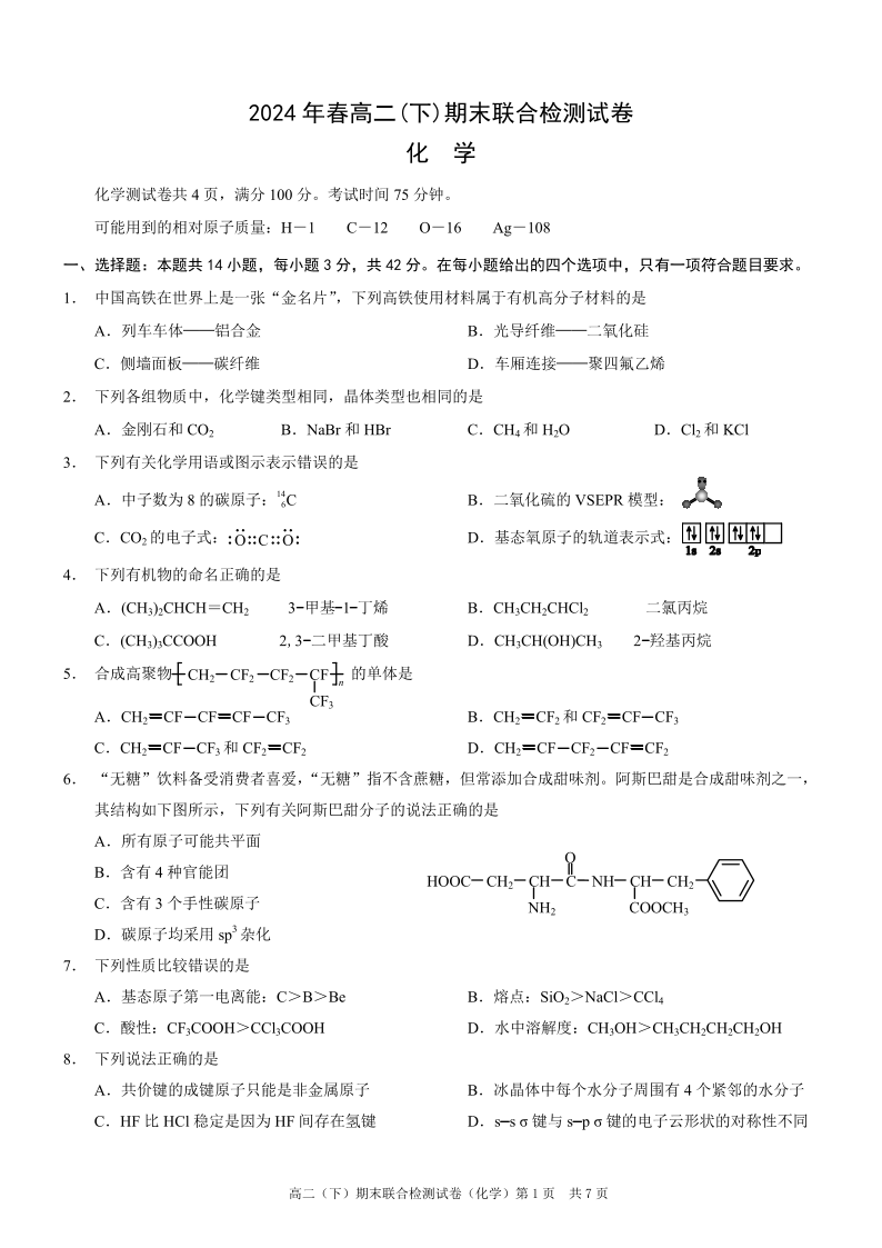 重庆康德卷高2025届(下)期末联合检测化学