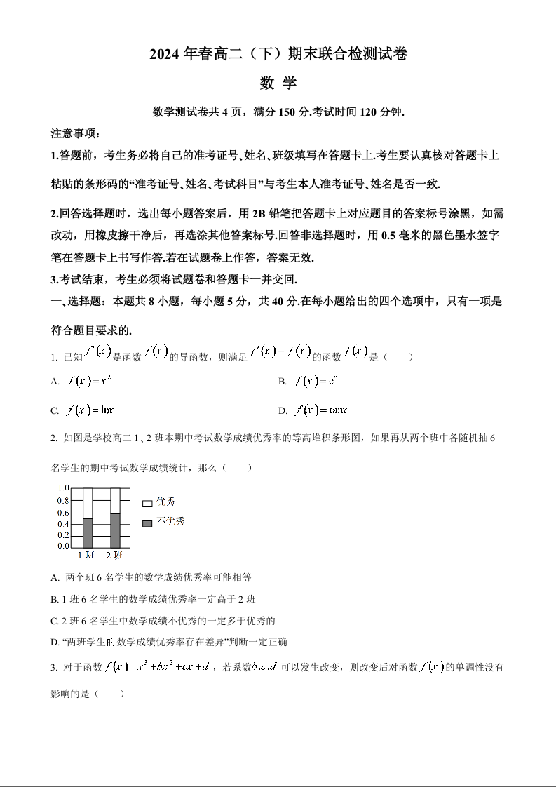 重庆市万州区高2025届下学期7月期末考试数学+答案