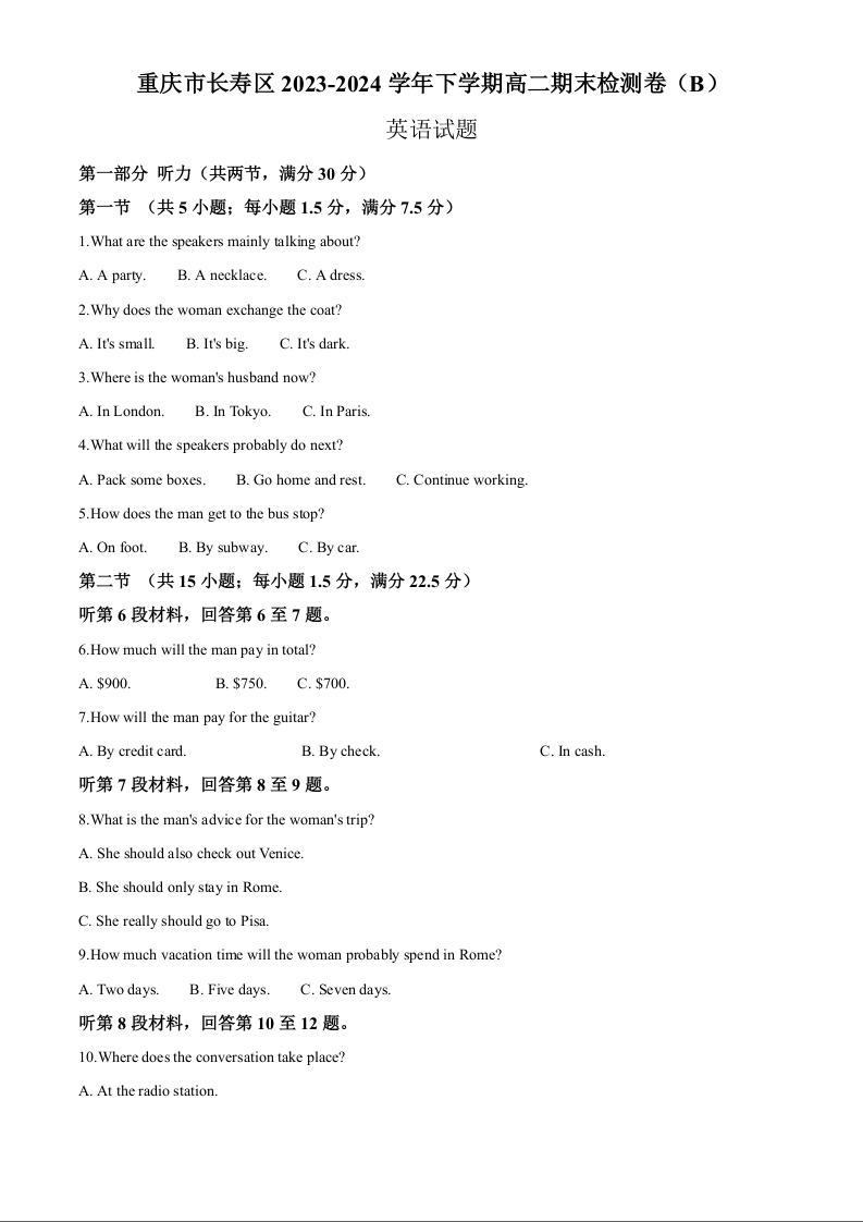 重庆市长寿区八校高2025届下学期7月期末联考英语+答案
