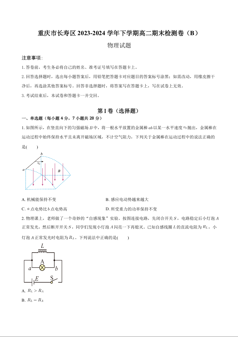 重庆市长寿区八校高2025届下学期7月期末联考物理+答案
