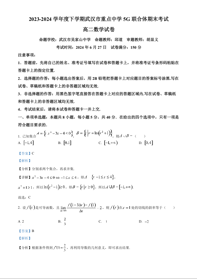 湖北省武汉市重点中学5G联合体高2025届下学期7月期末考试数学(解析版)