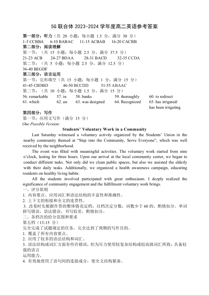 湖北省武汉市重点中学5G联合体高2025届下学期7月期末考试英语答案