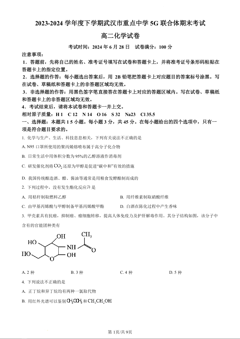 湖北省武汉市重点中学5G联合体高2025届下学期7月期末考试化学 (原卷版)