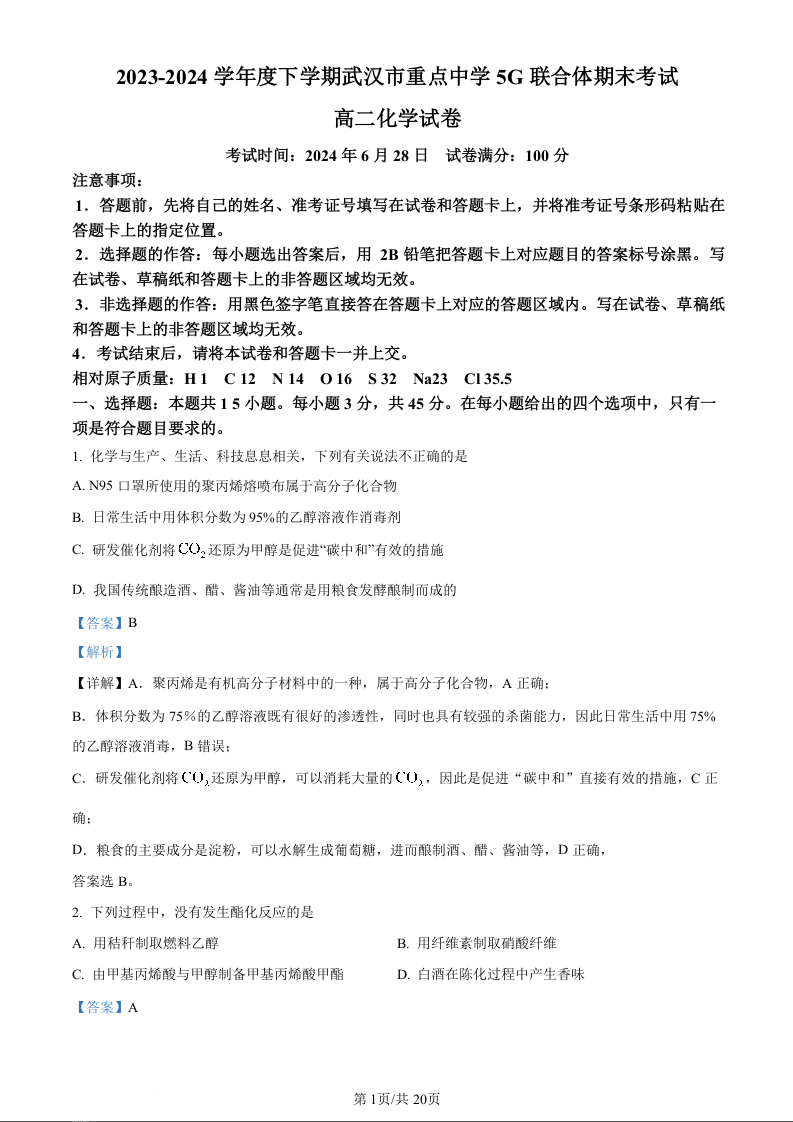 湖北省武汉市重点中学5G联合体高2025届下学期7月期末考试化学 (精品解析版)