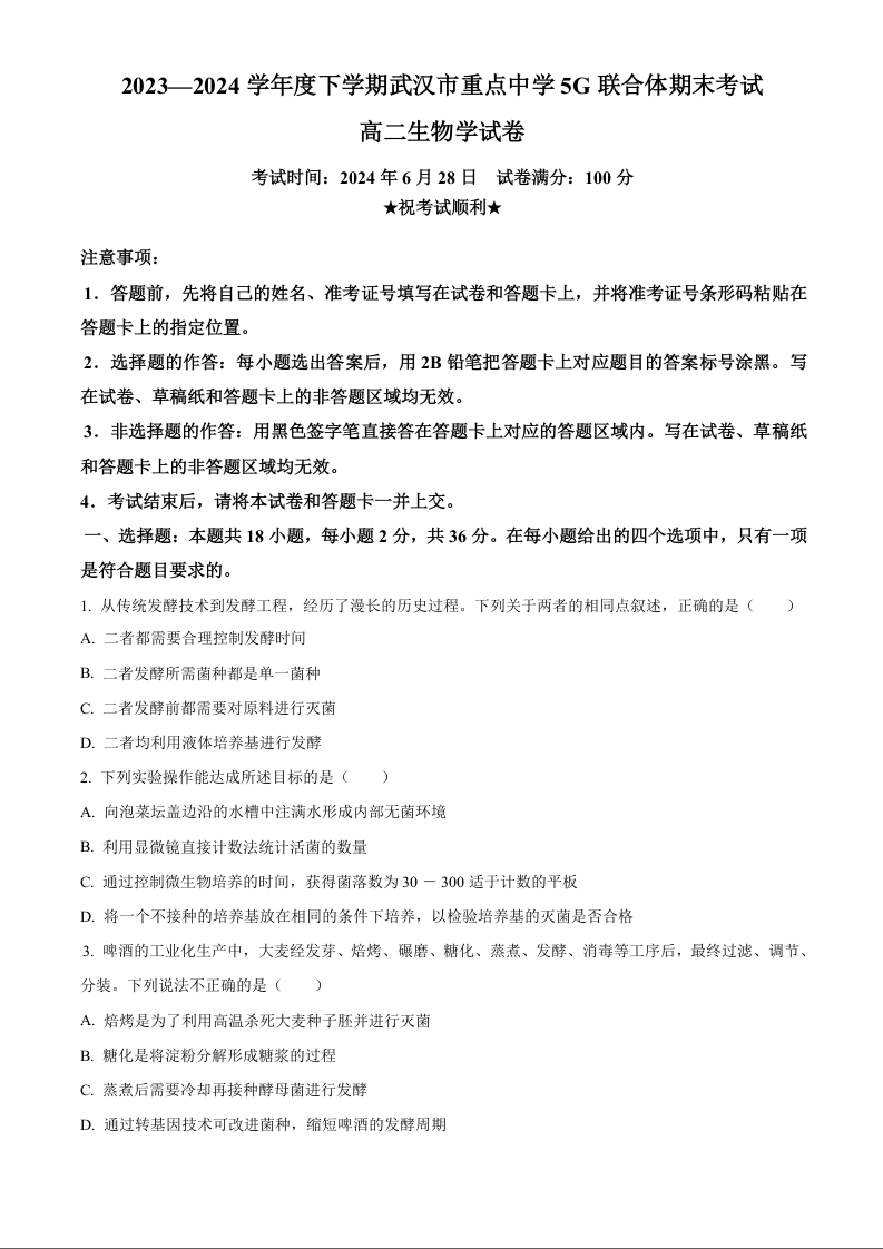 湖北省武汉市重点中学5G联合体高2025届下学期7月期末考试生物(原卷版)