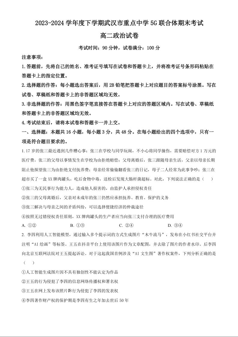 湖北省武汉市重点中学5G联合体高2025届下学期7月期末考试政治(原卷版)