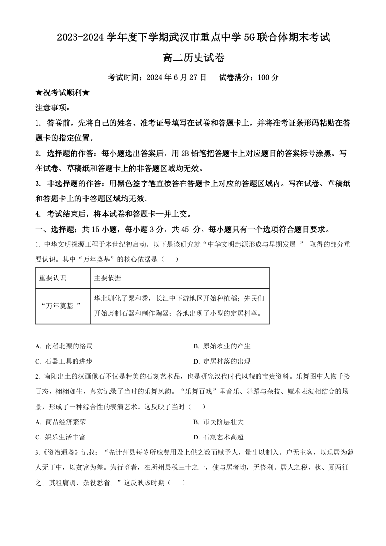 湖北省武汉市重点中学5G联合体高2025届下学期7月期末考试历史(原卷版)