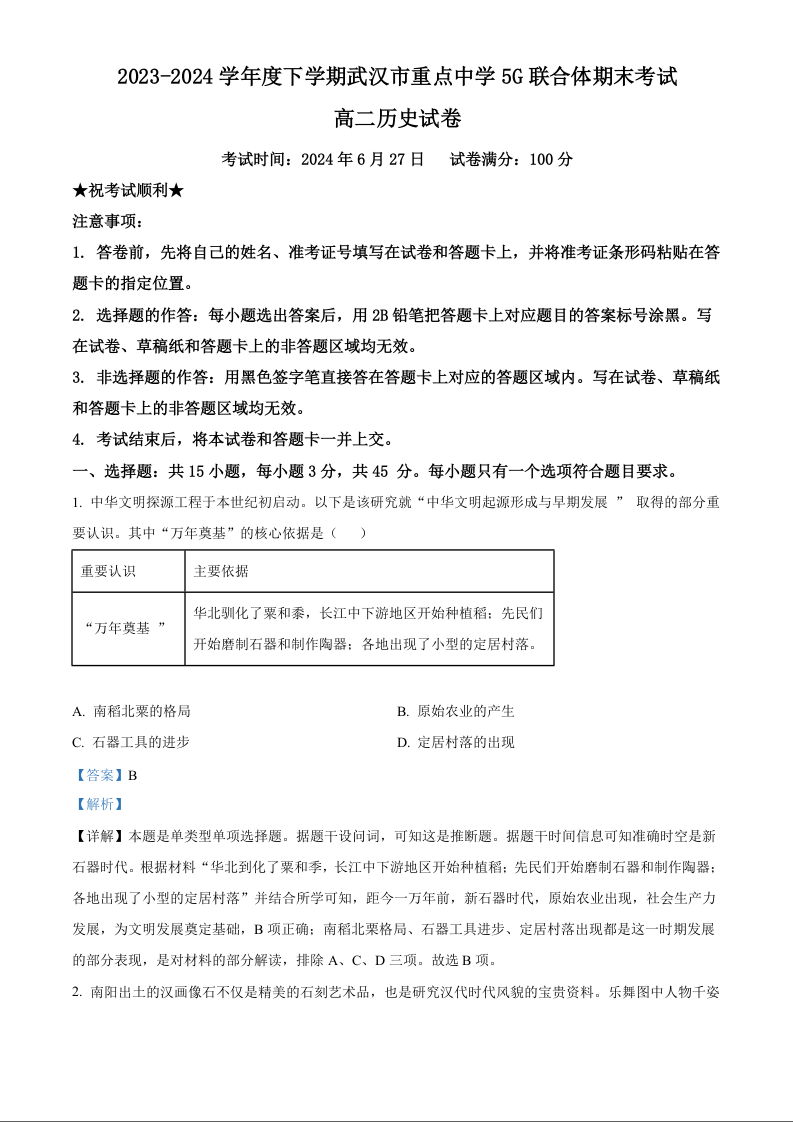 湖北省武汉市重点中学5G联合体高2025届下学期7月期末考试历史(解析版)
