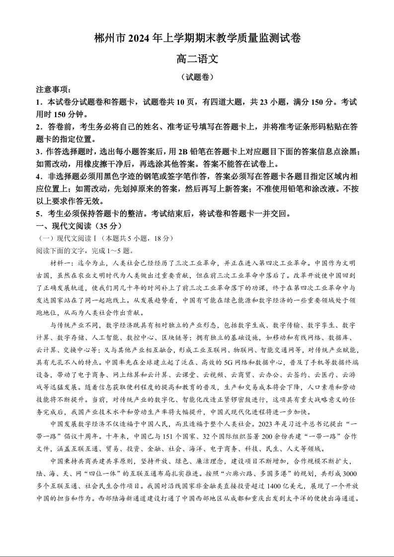 湖南省郴州市2024年上学期期末教学质量监测语文+答案