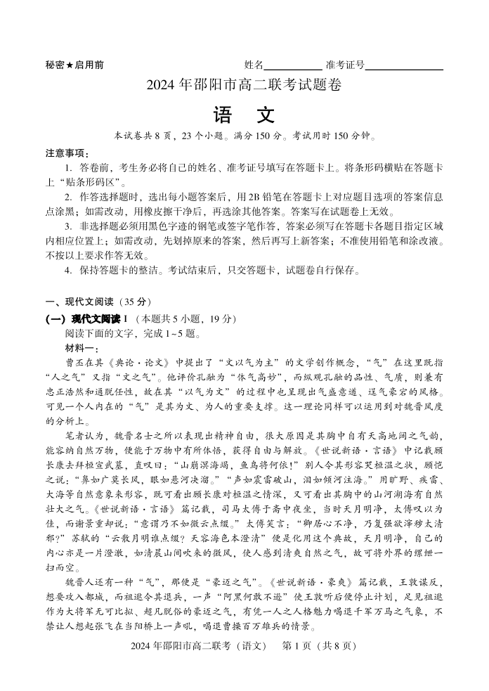 湖南省邵阳市高2025届下学期7月期末联考语文