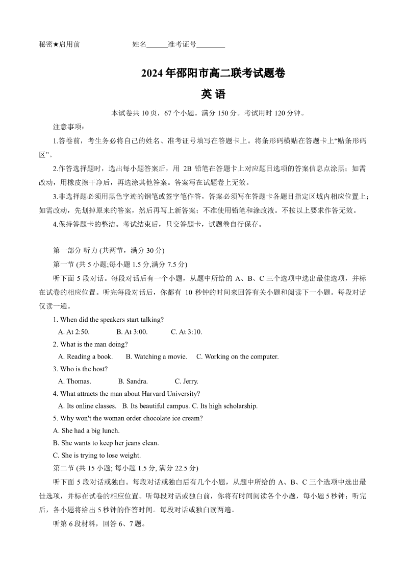 湖南省邵阳市高2025届下学期7月期末联考英语