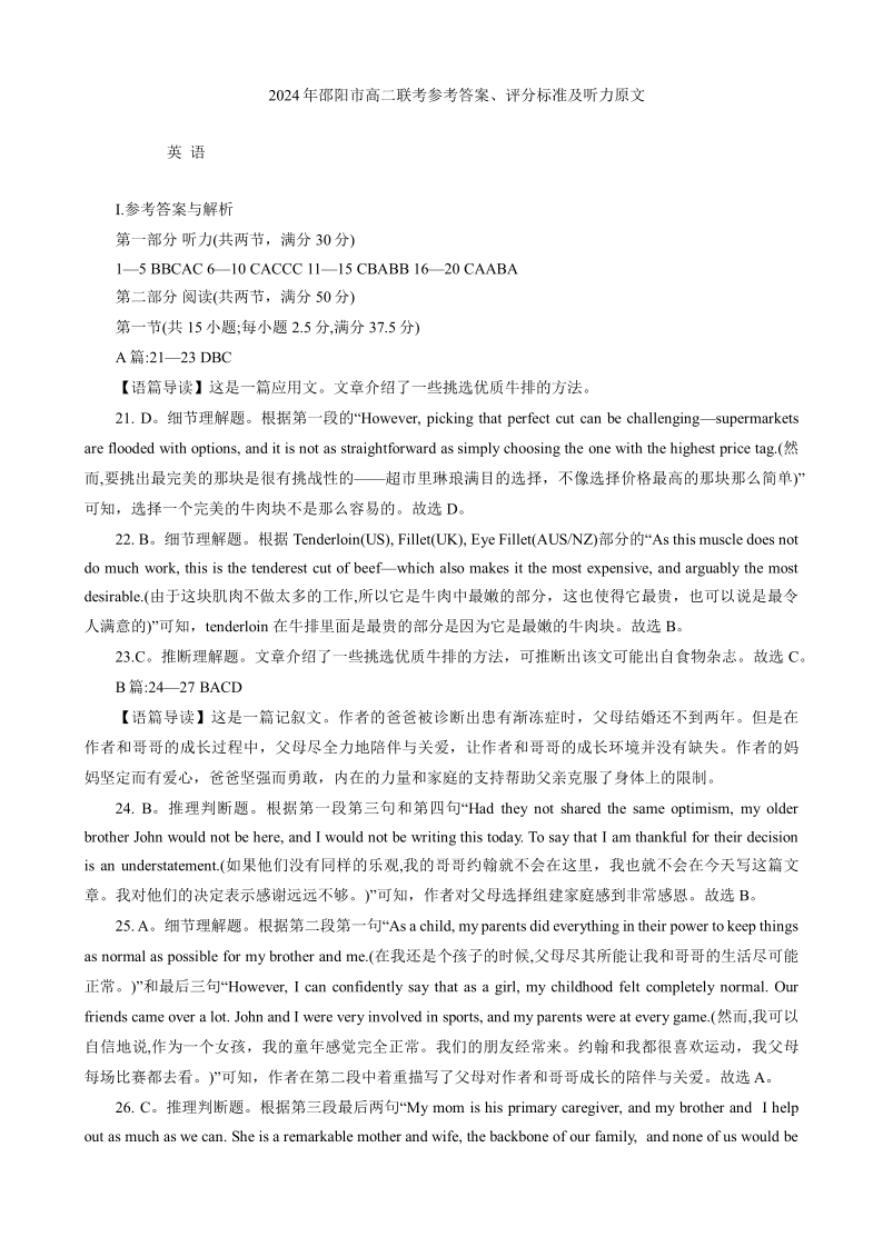 湖南省邵阳市高2025届下学期7月期末联考英语答案