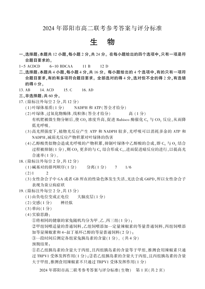湖南省邵阳市高2025届下学期7月期末联考生物答案