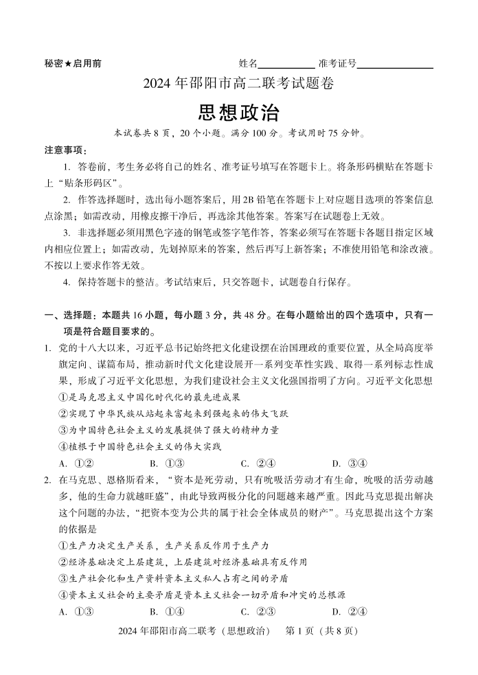 湖南省邵阳市高2025届下学期7月期末联考政治
