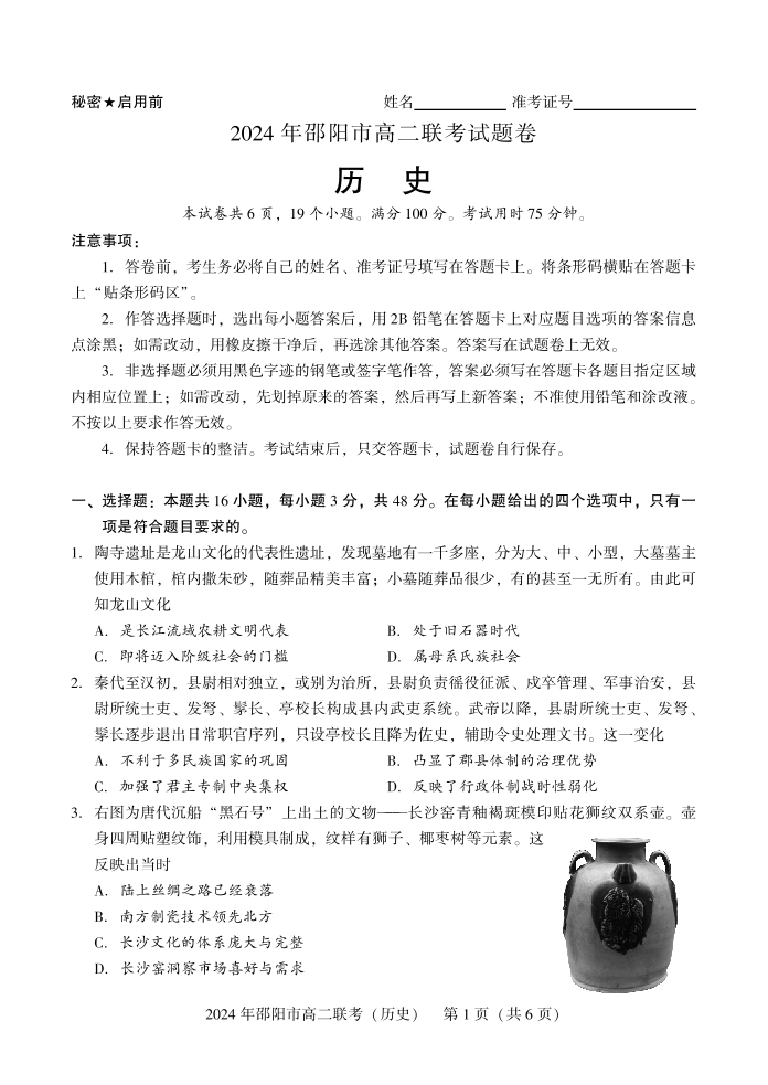 湖南省邵阳市高2025届下学期7月期末联考历史