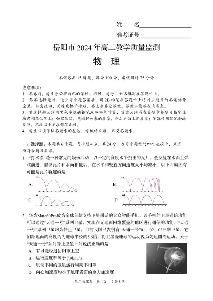 湖南省岳阳市2023-2024学年高二下学期期末考试物理