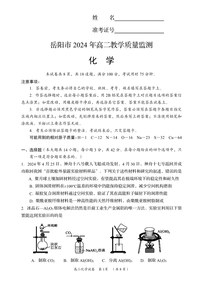 湖南省岳阳市2023-2024学年高二下学期期末考试化学