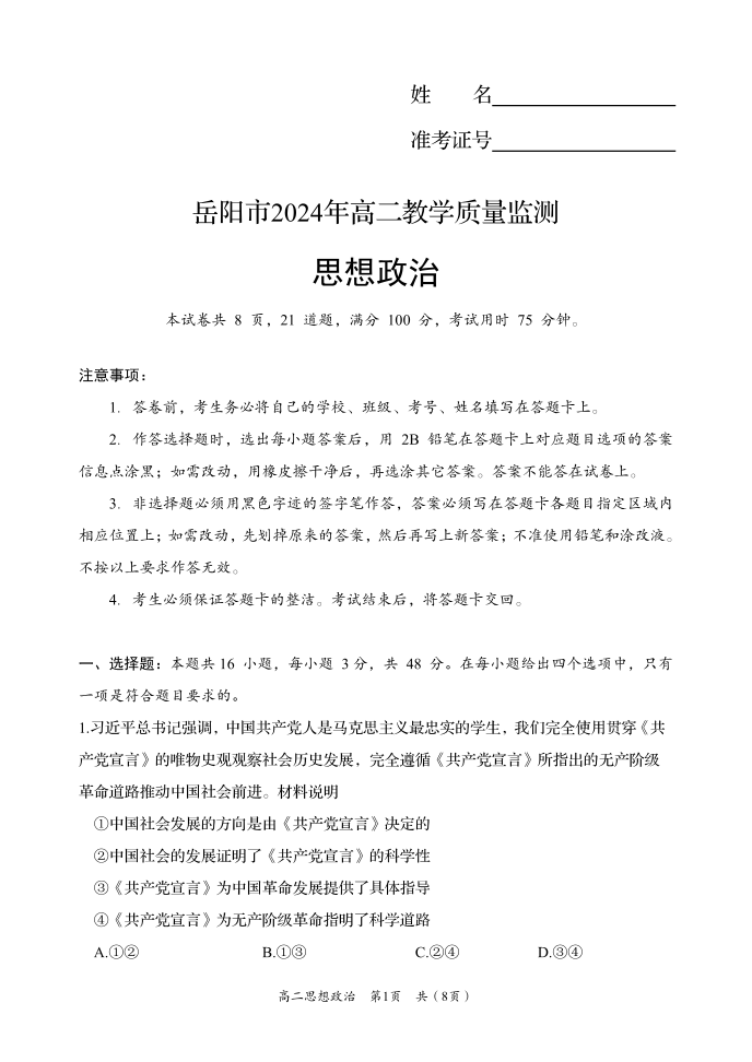 湖南省岳阳市2023-2024学年高二下学期期末考试政治