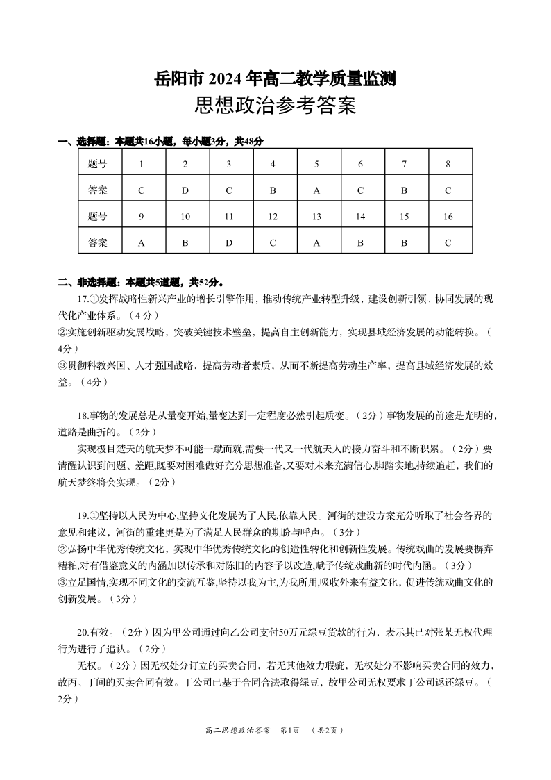 湖南省岳阳市2023-2024学年高二下学期期末考试政治答案