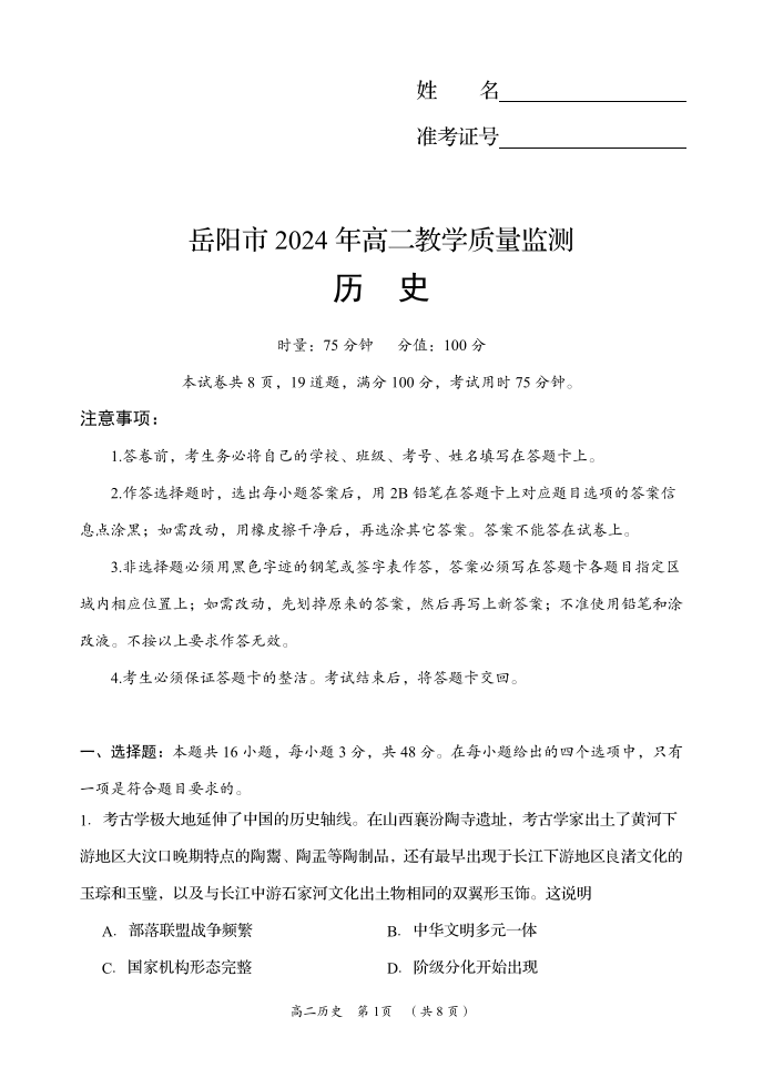 湖南省岳阳市2023-2024学年高二下学期期末考试历史